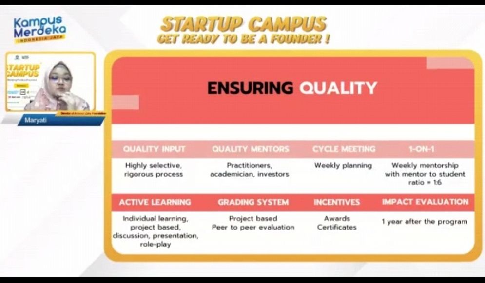 "Dari input atau seleksinya pun kita akan ketat. Karena memang kami ingin ensuring quality," kata Maryati dalam Kick Off Program StartUp Campus 2021, Selasa (29/6/2021).
