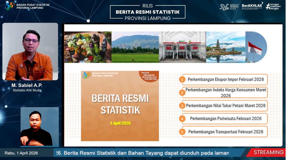 Selain itu, BPS juga mencatat inflasi Provinsi Lampung pada Maret 2026 sebesar 0,19 persen secara bulanan, lebih rendah dibandingkan Maret 2025 yang mencapai 1,96 persen. Secara tahunan, inflasi tercatat sebesar 1,16 persen.