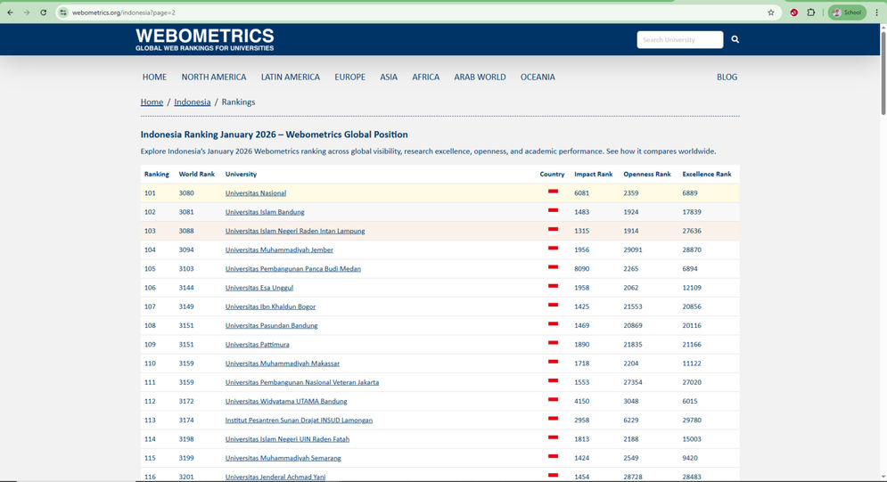 Webometrics merupakan platform pemeringkatan perguruan tinggi dunia yang menilai kinerja institusi secara multidimensi. Penilaian tidak hanya berfokus pada publikasi ilmiah, tetapi juga pada keterbukaan akademik, pengaruh keilmuan, serta visibilitas global perguruan tinggi melalui kehadiran digital.