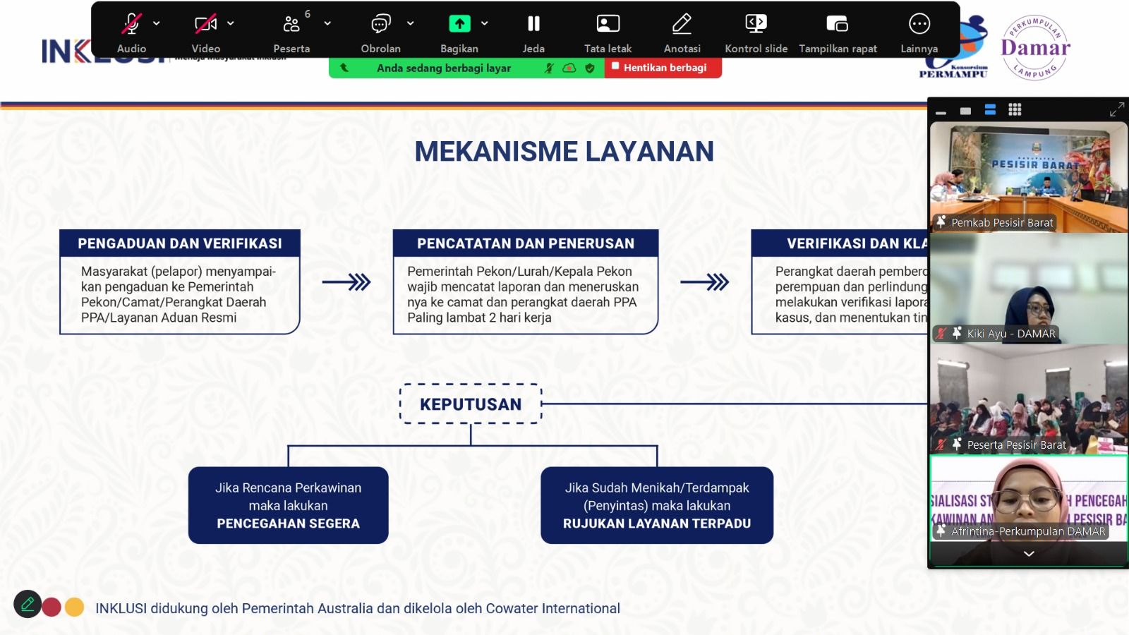 Damar Bersama Pemkab Pesibar Sinergi Sosialisasi Strada Pencegahan Perkawinan Anak (sumber: Ist)PESISIR BARAT - Perkumpulan Damar bersama Pemerintah Kabupaten bersinergi selenggarakan Sosialisasi Strategi Daerah Pencegahan Perkawinan Anak (STRADA PPA) Pesisir Barat.
