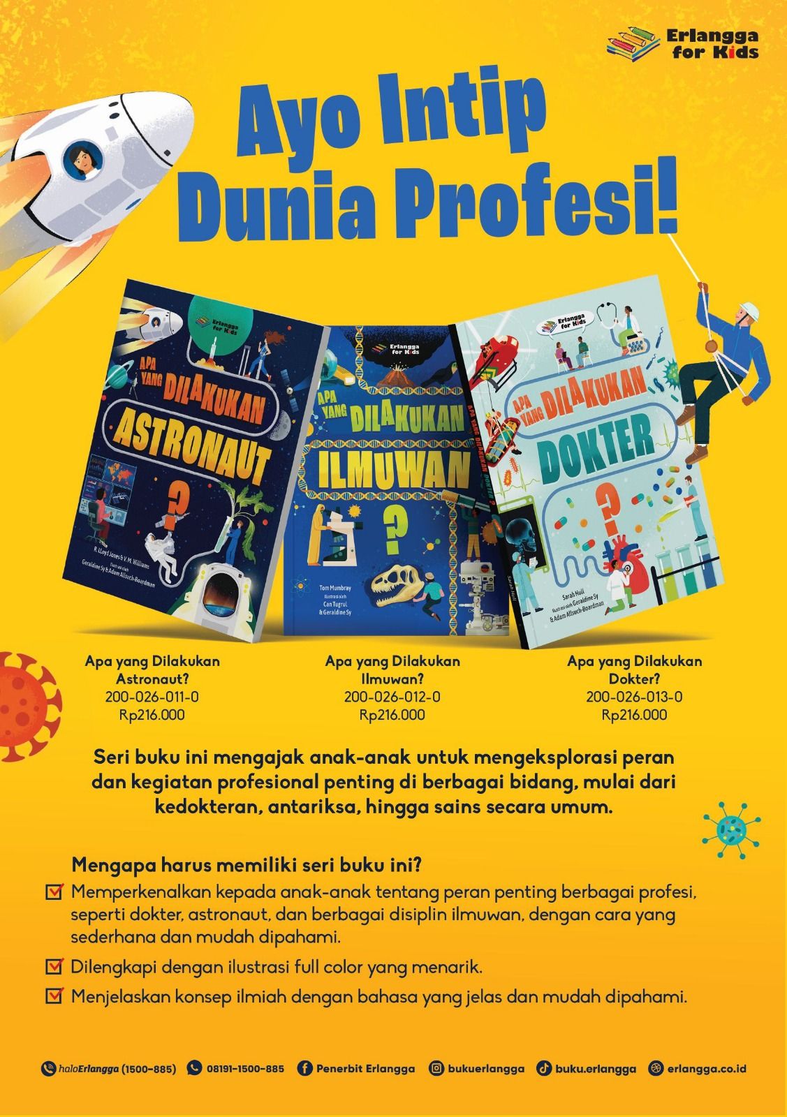 Penerbit Erlangga melalui lini Erlangga for Kids kembali menghadirkan bacaan edukatif anak bertajuk seri “Apa yang Dilakukan…”. (sumber: Penerbit Erlangga Lampung)PENERBIT Erlangga melalui lini Erlangga for Kids kembali menghadirkan bacaan edukatif anak bertajuk seri “Apa yang Dilakukan…”. Seri ini terdiri atas tiga judul, yakni Apa yang Dilakukan Astronaut? (200-026-011-0), Apa yang Dilakukan Ilmuwan? (200-026-012-0), dan Apa yang Dilakukan Dokter? (200-026-013-0). Masing-masing buku dibanderol dengan harga Rp216.000.