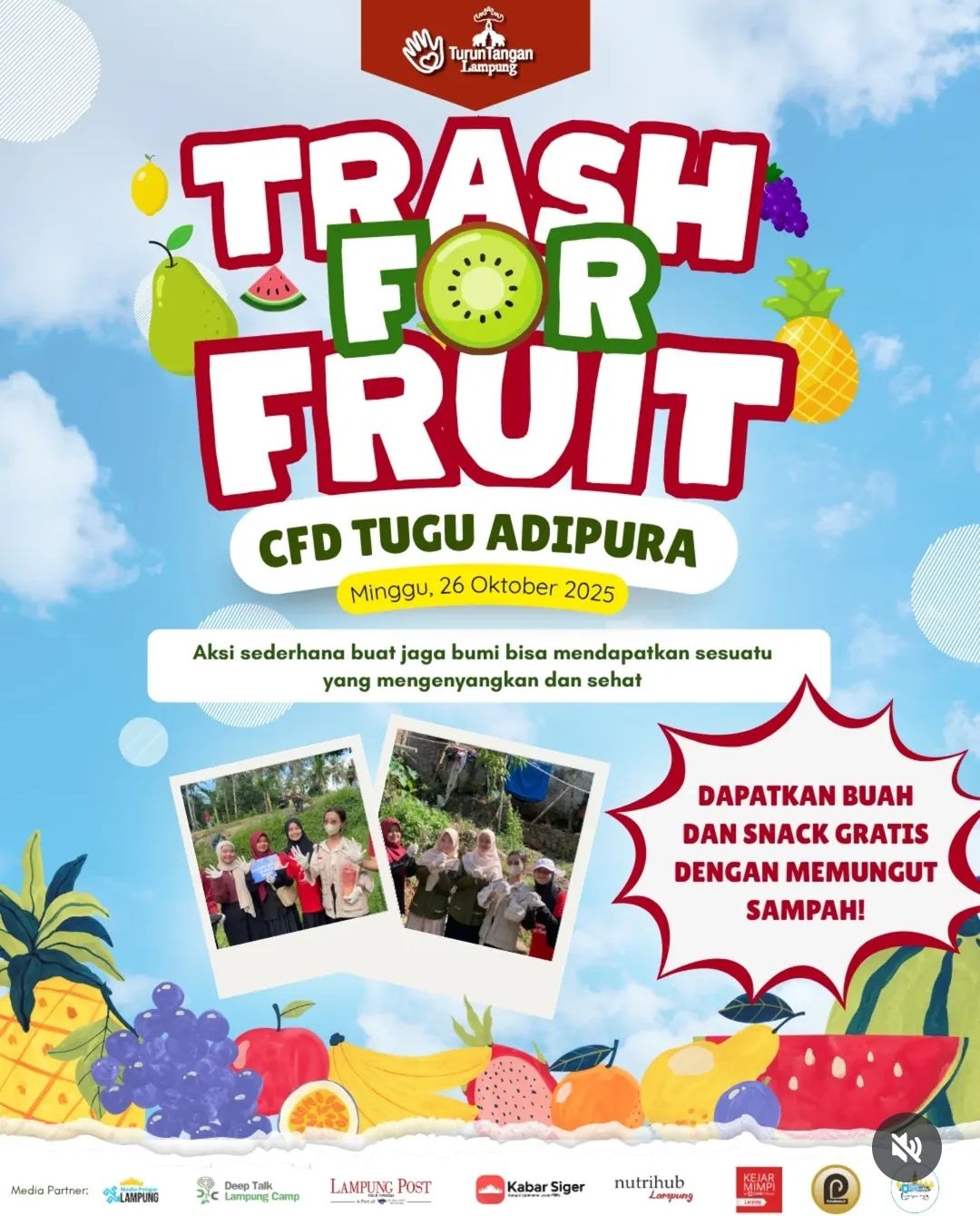 Komunitas TurunTangan Helat Aksi Trash For Fruit (sumber: Ist)BANDARLAMPUNG - Komunitas TurunTangan Lampung sukses menggelar kegiatan peduli lingkungan melalui aksi 'Trash For Fruit' di area Car Free Day Tugu Adipura pada Minggu, 26 Oktober 2025.