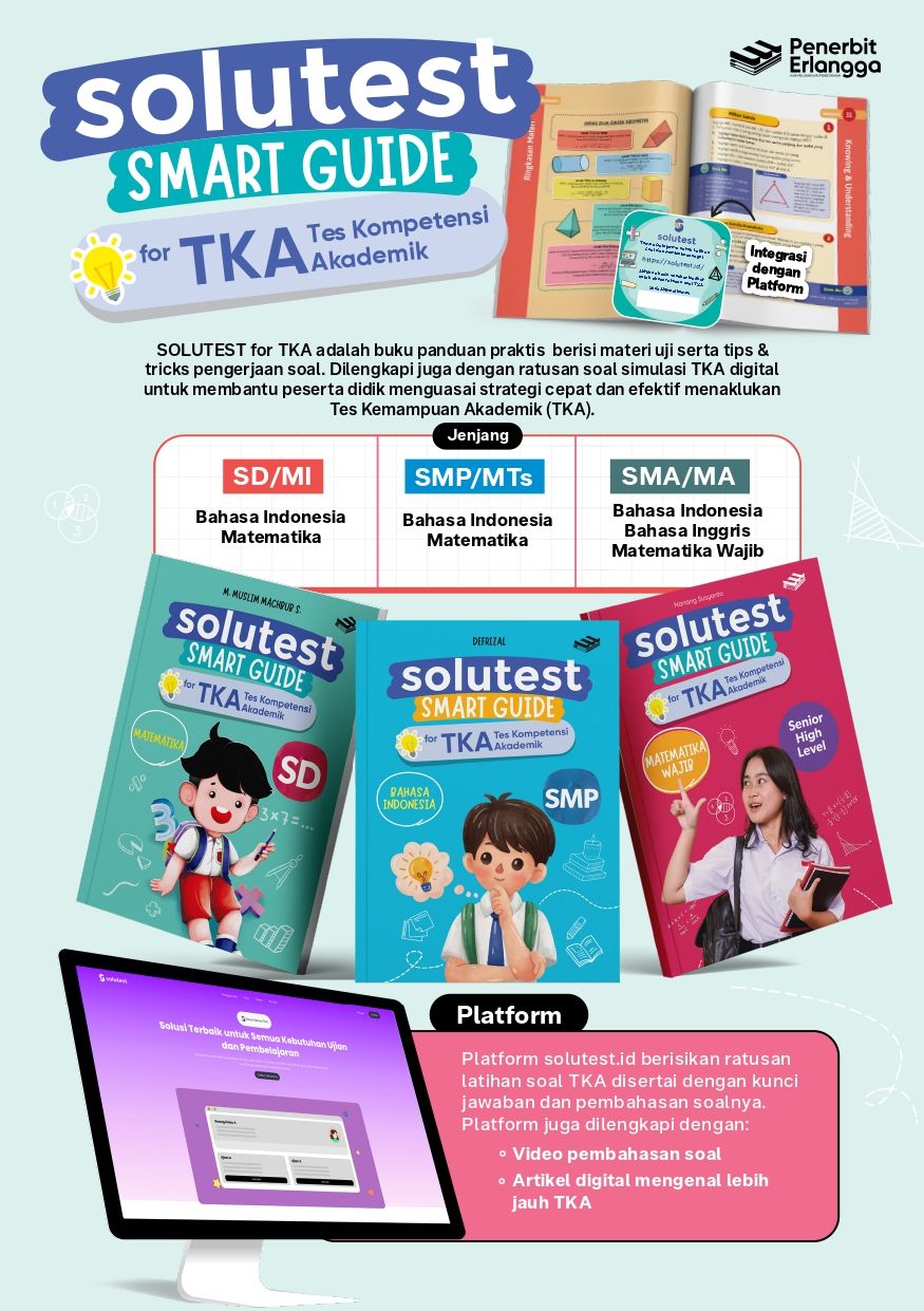 Solutest for TKA Bahasa Indonesia dan Matematika untuk jenjang SD, SMP, dan SMA (dilengkapi tambahan Bahasa Inggris) diterbitkan oleh Penerbit Erlangga. Dengan ketebalan 48 halaman full color, buku ini dirancang sebagai panduan belajar terarah bagi peserta didik dalam menghadapi TKA.