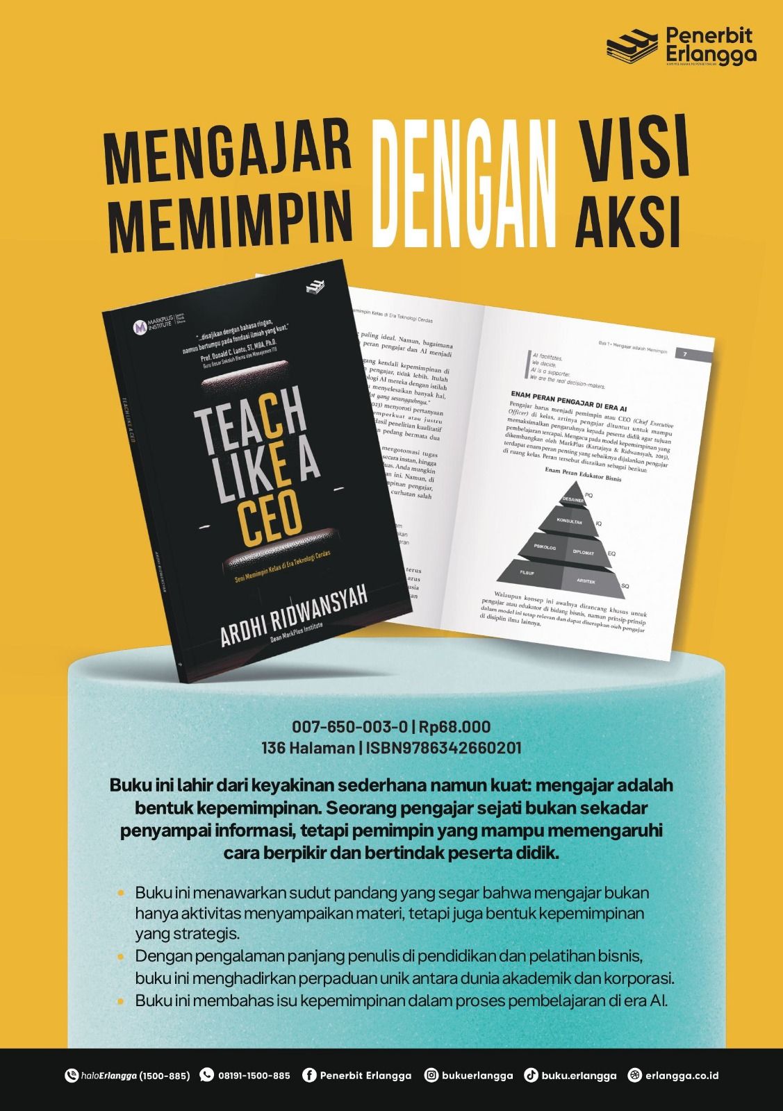 Resensi Buku (sumber: Penerbit Erlangga)Di tengah perubahan besar dunia pendidikan yang dipengaruhi perkembangan teknologi, kecerdasan buatan, dan tuntutan kompetensi abad ke-21, peran pengajar mengalami transformasi signifikan. Guru, dosen, pelatih, maupun fasilitator tidak lagi cukup hanya menjadi penyampai materi. Mereka dituntut menjadi pemimpin pembelajaran yang mampu membentuk pola pikir, karakter, dan arah perkembangan peserta didik. Gagasan inilah yang menjadi fondasi utama buku Teach Like A CEO.